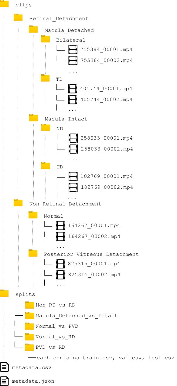 This structured classification helps in systematically analyzing and interpreting the retinal pathologies present in the ultrasound data. You can see the structure of dataset folders in the below figure which reflect the labeling protocol.