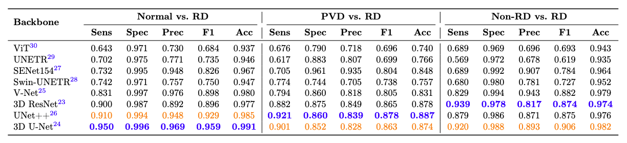 Table 1: Performance of models on three retinal detachment (RD) classification tasks: Normal vs. RD, PVD vs. RD, and Non-RD vs. RD. Metrics include sensitivity (Sens), specificity (Spec), precision (Prec), F1-score (F1), and accuracy (Acc). Models are sorted in ascending order based on sensitivity for the Normal vs. RD task. The best-performing model based on sensitivity for each task is shown in bold blue, and the second-best is highlighted in orange.