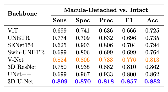 Table 2: Performance of models on macular status classification (macula-detached vs. -intact). Metrics include sensitivity (Sens), specificity (Spec), precision (Prec), F1-score (F1), and accuracy (Acc). The best-performing model based on sensitivity is shown in bold blue, and the second-best is highlighted in orange. Models follow the same ordering as in Table 1 to facilitate cross-task comparison.