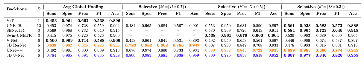 Table 3: Comparison of temporal pooling strategies for Normal vs. PVD classification. All input clips consist of 96 frames, which are grouped into D temporal segments prior to classification. Selective pooling selects the top k* = [D * r] segments, where r is the selection ratio. For each backbone, the best-performing pooling strategy (by sensitivity) is shown in bold. Within each pooling strategy, the best-performing backbone is highlighted in blue and the second-best in orange, both determined by sensitivity. Dashes (--) indicate configurations where [D * r] = D, meaning all segments are retained and no selection occurs.